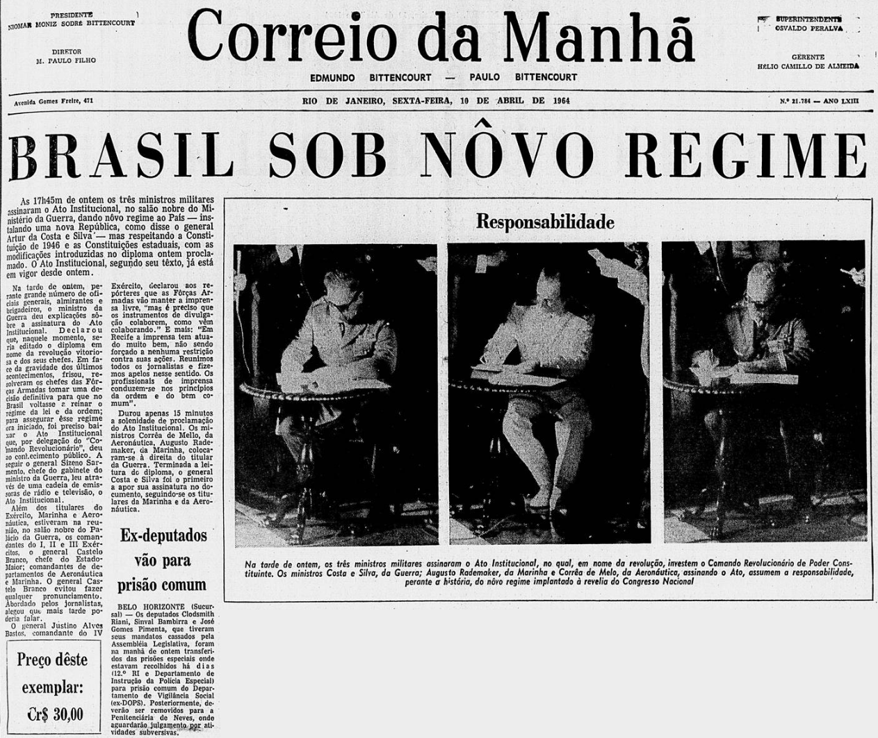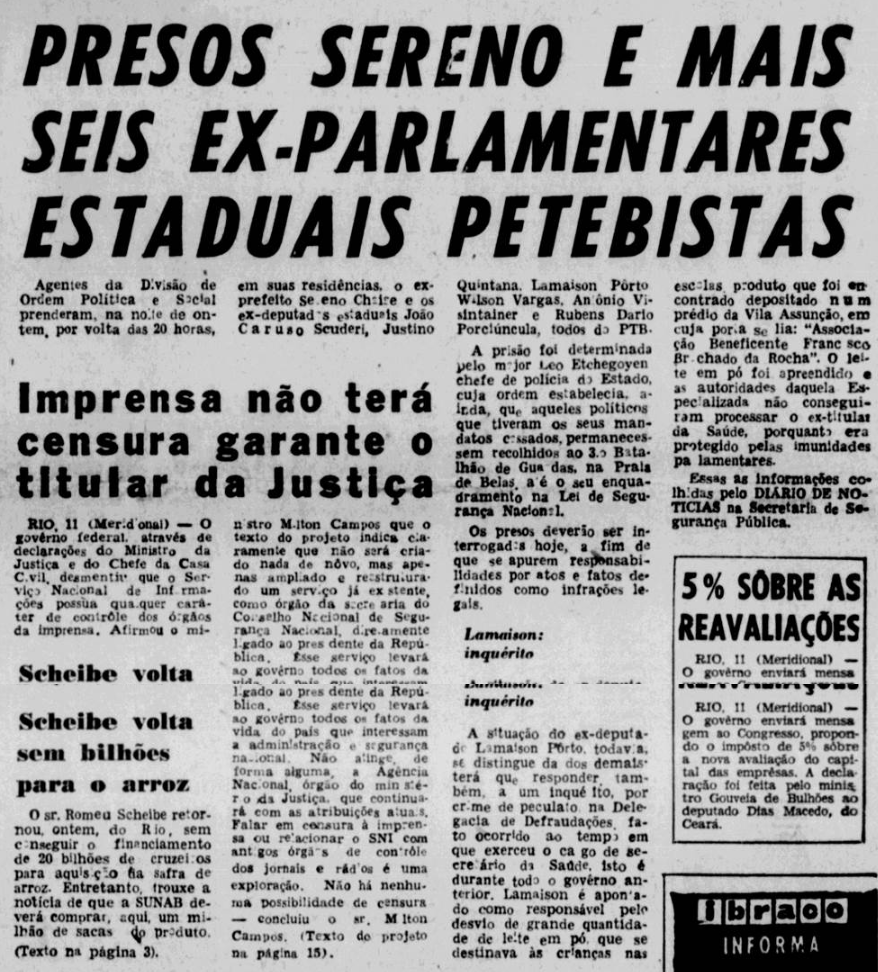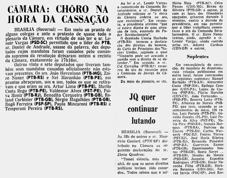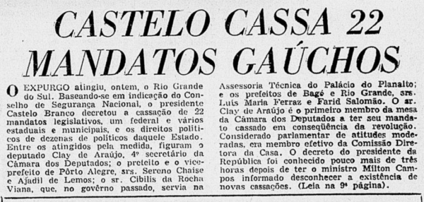Consolidado o golpe, baseada no Art. 10 do primeiro Ato Institucional, foi publicada a primeira lista de cassações da ditadura no Diário Oficial de 10 de abril de 1964.