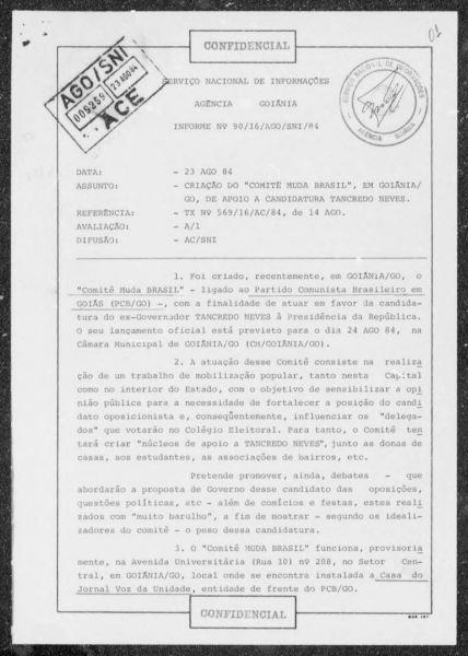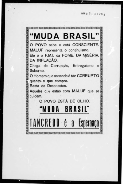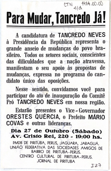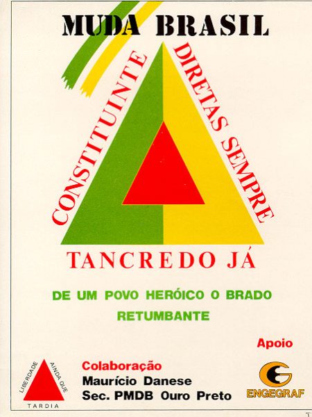 Material publicitário da campanha pelas Diretas e da campanha de Tancredo Neves. Tancredo Neves - Um homem para o Brasil. Belo Horizonte - Fundação Presidente Tancredo Neves - Autêntica, 2010. Página 100.