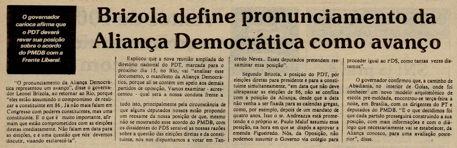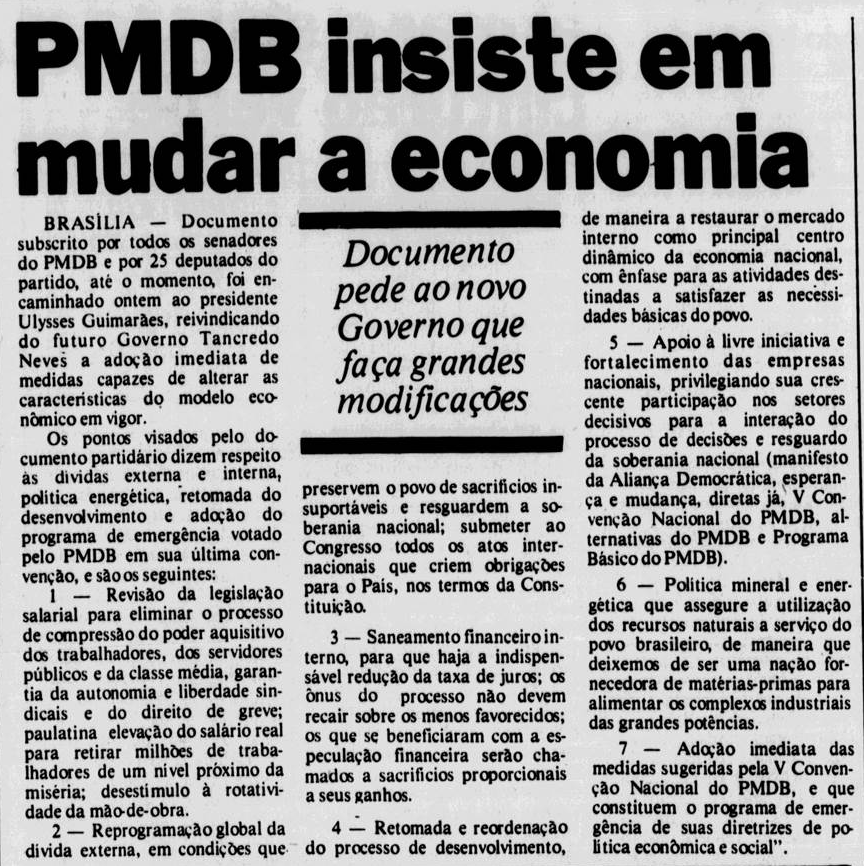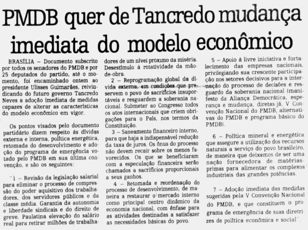 O MDB, que durante o regime militar se posicionou como oposição de espectro político amplo e democrático, voltou-se para o cumprimento de uma de suas mais caras bandeiras de luta: a convocação de uma assembleia nacional constituinte. Esse foi, desde os primórdios do partido, um compromisso inarredável em prol da restauração da democracia.