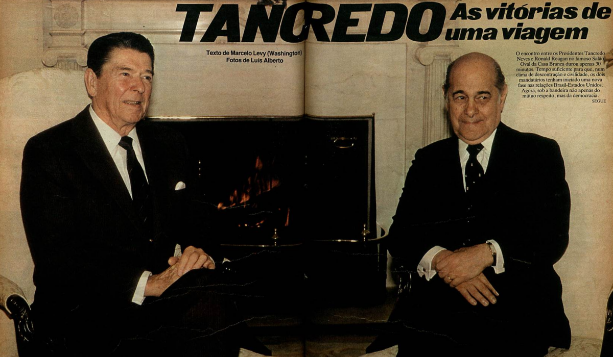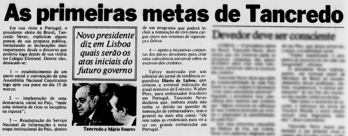 Em 19 de janeiro, poucos dias após a eleição no colégio, Tancredo empreendeu, junto com pequena comitiva, uma viagem em que encontrou-se com chefes de estado, autoridades financeiras e religiosas internacionais.  Houve reuniões  com o Papa, então João Paulo II, o diretor-presidente do Fundo Monetário Internacional (FMI),  François Miterrand, Ronald Reagan, Raul Alfonsin, os escritores argentinos Jorge Luiz Borges e Ernesto Sábato, grandes estrelas do futebol brasileiro que então jogavam na Europa, como Sócrates e Toninho Cerezo.