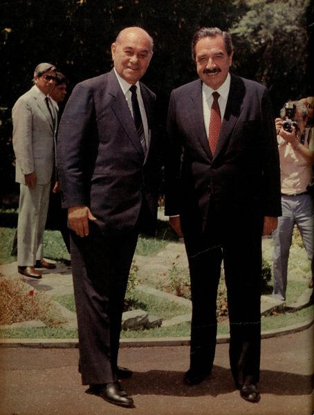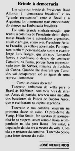 Caloroso brinde à democracia com o Pres. Raul Afonsin e o Escritor Jorge Luis Borges (Jornal do Brasil RJ)